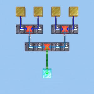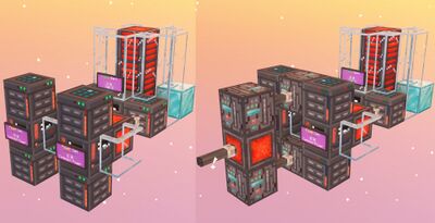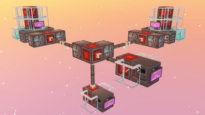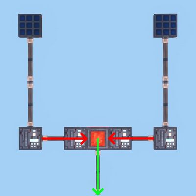 Splitting from one power source to many inputs is a very common practice for systems with large amounts of multiblocks, like printer or furnace arrays. Both merging and splitting very heavily play a role in HE’s power system.